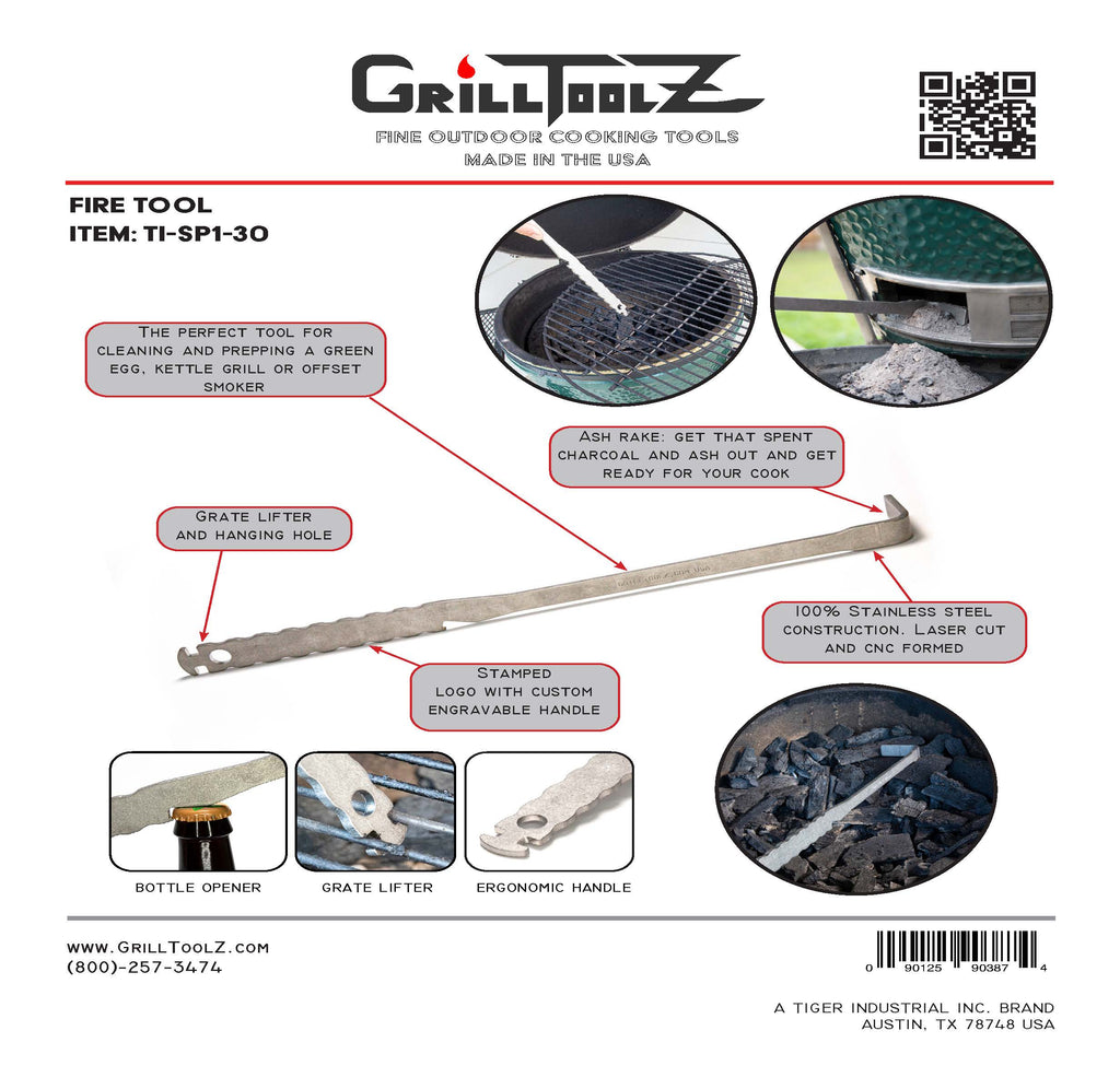 GrillToolZ: Fire Tool- Ash tool, Grill prep tool, Grate lifter, Bottle opener - Made in USA